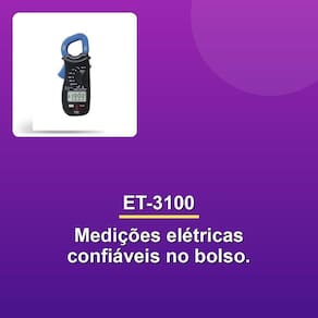 Compacto e leve, o ET-3100 possui dimensões de 151x65x34 mm e pesa apenas 127 g, tornando-o extremamente portátil. Sua garra possui uma abertura de 27 mm, permitindo medições em condutores com diâmetro de até 25 mm. Projetado para oferecer segurança e confiabilidade, este modelo é categorizado como CAT II 600V, oferecendo proteção adequada para medições em instalações elétricas de baixa tensão.