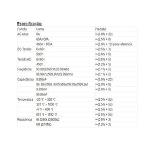 O Alicate Amperímetro Multímetro Automático Modelo St184 Ac/Dc é um instrumento de medição portátil e . Com um display digital de cristal líquido e uma luz de fundo, oferece uma medição precisa em diversas situações. Esse alicate amperímetro multimetro automático possui uma proteção contra sobrecarga e indicação de bateria fraca, o que garante sua durabilidade e confiabilidade. Com uma ampla faixa de medição de capacitância, você pode realizar medições precisas de 9.999nf a 99.99mf. Além disso, o alicate amperímetro possui uma faixa de medição de corrente AC de 6 a 400A, permitindo que você verifique facilmente os níveis de corrente em seus equipamentos. Sua cor preto/amarelo confere um design moderno e atrativo, enquanto o display LCD de 6000 contagens garante uma leitura clara e fácil de entender. O alicate amperímetro também possui uma faixa de medição de resistência de 6k a 10m, o que o torna adequado para uma ampla gama de aplicações. Com faixas de tensão de medição AC de 6-450V e tensão DC de 6V-500V, você pode medir com precisão a tensão em seus dispositivos elétricos. Outra característica importante desse alicate amperímetro é a medição automática, onde o multímetro reconhece automaticamente se a corrente é AC ou DC, facilitando ainda mais o uso. O pacote inclui o medidor de braçadeira Aneng ST184, duas pontas de teste e uma ponta de teste termopar K, além do manual do usuário para auxiliar na instalação e configuração. Garantimos a qualidade do nosso produto e estamos disponíveis para responder a qualquer dúvida ou auxiliar pós-venda. As imagens são meramente ilustrativas e podem haver variações de cor e tamanho do produto anunciado, dependendo da disponibilidade em . Adquira agora o Alicate Amperímetro Multímetro Automático Modelo ST184 Ac/Dc e tenha um instrumento de medição preciso e confiável em suas mãos. Marca: Não Informado