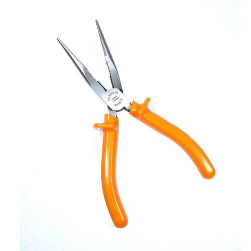 Características: Alicate de Bico Meia Cana Longo Reto. Medida: 8' Composição: Alça de PVC, Bico de Aço Cromo Vanádio, que proporciona resistência e durabilidade. Capacidade de corte: Fios, Cabos, Arames, Pregos. Material Duro: 2mm (aço) Material Mole: 3mm (Alumínio, Cobre, Latão, Plástico, etc...) Superior ao especificado na norma DIN (1,6mm). Validade: Indeterminada. 1000V Isolação. Abas Protetoras que Proporcionam Maior Conforto.