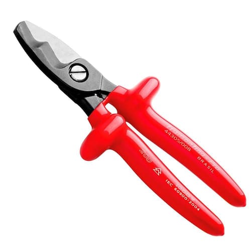 -forjada em aço cromo vanádio. -cabeça e articulação fosfatadas. -têmpera total no corpo. -têmpera por indução no gume de corte. -empunhadura com dupla camada de isolamento -isolação elétrica de 1.000 v ca. -produto em conformidade com a iec 60900 e nr 10. -indicadas para trabalhos em baixa tensão até 1.000 v em corrente alternada e 1.500 v em corrente contínua. -capacidade máxima para corte de cabos de 20 mm de diâmetro considerando a capa de pvc que cobre o cabo . -as ferramentas isoladas tramontina pro são submetidas a vários ensaios para atender às normas iec 60900 e nr 10: ensaio de impacto; ensaio de resistência dielétrica; ensaio de aderência da isolação; ensaio de flamabilidade; ensaio de isolação elétrica. -gama variada de ferramentas para aplicação segura em áreas energizadas com tensões de trabalho de até 1.000 v. -utilizada por profissionais que trabalham em áreas de risco redes energizadas e instalações industriais . -as ferramentas são produzidas e testadas de acordo com normas específicas. -a iec 60900 é uma norma internacional que especifica requisitos para a fabricação e aprovação de ferramentas isoladas. Equivalente a norma européia en 60900. -a nr 10 é uma norma regulamentadora brasileira que estabelece as condições mínimas para garantir a segurança de trabalhadores que interajam com instalações elétricas e serviços com eletricidade.