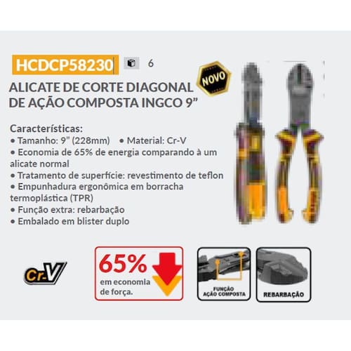 Características: Tamanho: 9 228mm Material: cr-v Economia de 65% de energia comparando à um Alicate normal Tratamento de superfície: revestimento de teflon Empunhadura ergonômica em borracha Termoplástica tpr Função extra: rebarbação Marca: Não Informado