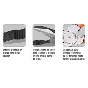 Forjada em aço cromo vanádio.Cabeça e articulação polidas.Têmpera total no corpo.Têmpera por indução no gume de corte.Maior arresta de corte para facilitar o trabalho em uma ampla gama de bitolas de fios.Ranhuras cruzadas no bico para maior agarre.Dispositivo para prensar terminais de bitolas até 10 mm sem isolação.Isolação elétrica de 1.000 V CA.Produto em conformidade com a NBR9699 e NR10.Os alicates de corte são testados quanto à resistência ao desgaste do gume de corte em máquina de ensaio específica.Os alicates possuem dureza diferenciada no gume de corte e no corpo.Os alicates também são testados com relação à aderência das empunhaduras de PVC.Um ensaio de extrema importância analisa o grau de isolação do revestimento aplicado sobre os cabos dos alicates isolados, e que promove segurança na sua utilização em locais com tensões de até 1.000 V CA.Puxar, prender, enrolar, deformar e cortar arames e chapas finas.Prensar terminais de bitolas até 10 mm sem isolação.As ferramentas são produzidas e testadas conforme normas específicas.