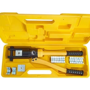 Alicate hidráulico prensa crimpa terminais 10 a 300mm . Acompanha 12 matrizes hexagonais: 10,16, 25, 35, 50, 70, 95, 120, 150, 185, 240 e 300 mm. Com 16 toneladas de pressão máxima é exclusivamente para crimpagem de terminais em cabos de alumínio ou cobre.