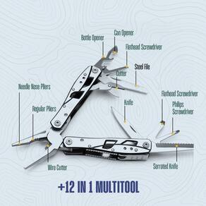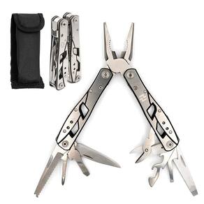 Contém 10 ferramentas diferentes, incluindo cortador de fio, abridor de garrafas, faca, serra de madeira, chave de fenda Phillips, abridor de garrafas, chave de fenda, furador, lixa de unhas, trituradores de bico fino - PRONTO PARA USO - Esta ferramenta multifuncional de empilhadeira será seu produto preferido para fixar, reparar, combinar ou construir. É uma ferramenta leve e multiuso que deve estar sempre com você. - DURABILIDADE - É feito de aço inoxidável premium que não enferruja. Essa ferramenta multifuncional tem uma vida útil durável. Este equipamento é bem composto, o que o torna suave e confortável de usar. - 12 FERRAMENTAS EM 1 - Esta ferramenta múltipla tem 12 ferramentas, incluindo um alicate e um cortador de fio, um abridor de garrafas, uma serra, facas, uma chave de fenda e uma régua. - COMPACTO E FÁCIL DE USAR NO BOLSO - Este produto tem apenas 10 cm de comprimento. Você pode colocá-lo no bolso e carregá-lo facilmente porque é leve e compacto. - FÁCIL DE OPERAR - Você pode abrir suavemente este alicate multiferramenta com uma mão e operá-lo. Possui lâminas de travamento fortes que lhe dão a confiança de usar essa ferramenta múltipla quando necessário.