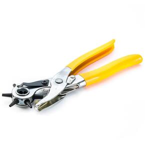 Alicate perfurador, ideal para trabalhos em couro, papel e PVC. Conta com 6 tamanhos de perfuração: 2,5mm, 3mm, 3,5mm, 4mm, 4,5mm e 5mm. A parte metálica é fabricada em aço 45 com acabamento cromado, garantindo alta durabilidade e resistência. A alça é revestida em borracha, oferecendo conforto durante o uso e melhor ergonomia. Seu design robusto e funcional permite trocas rápidas entre os tamanhos com fixação firme, sendo perfeito para aplicações como perfuração de cintos, bolsas, etiquetas, folhas e muito mais.