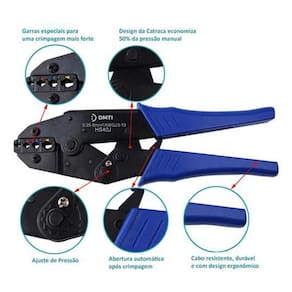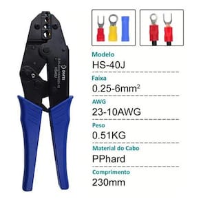 Especificações técnicas: - modelo - hs-40j - bitola do cabo: de 0,25 até 6,0 mm - material do corpo: aço - material do cabo: pp - aplicação: para prensagem e crimpagem de terminais isolados - awg: 23-10 - comprimento: 230mm - peso: 650 gramas