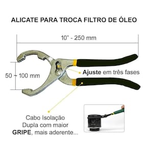 Alicate Chave Para Filtro de Óleo Ajustável 50-100mm ? Ferramenta ProfissionalO Alicate Chave para Filtro de Óleo é a ferramenta ideal para quem busca praticidade e eficiência na remoção de filtros de óleo e tubos de diferentes tamanhos. Com três níveis de ajuste, ele permite um encaixe preciso em filtros com diâmetros entre 50 e 100 mm, garantindo um trabalho mais seguro e sem danos à peça.Principais vantagens:- Versátil ? Além de filtros de óleo, pode ser utilizado em tubos de escapamento e sistemas industriais.- Alta resistência? Produzido em aço forjado com acabamento cromo-níquel, garantindo maior durabilidade e resistência à corrosão.- Maior aderência ? Cabo emborrachado Soft de camada dupla, proporcionando mais conforto e firmeza durante o uso.Especificações Técnicas:Capacidade do Filtro: 50 a 100 mmComprimento Total: 10 (250 mm)Material: Aço forjadoAcabamento: Cromo-níquel (fosco)Cor do Alicate: PrateadoCabo: Verde com detalhe em amarelo, revestimento emborrachado Soft camada duplaAjuste: 3 níveis (50 - 100 mm)Peso: 328 gItens inclusos:- 01 Alicate Chave para Filtro de Óleo Ajustável 50-100mmIdeal para profissionais da mecânica e manutenção automotiva! Garanta já o seu!