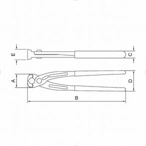 Ref.: 44046125. Marca: Tramontina. Forjada em aço carbono especial. Topo da cabeça e laterais polidas. Têmpera total. Corpo fosfatizado. Cabos com revestimento especial. Os alicates de corte são testados quanto à resistência ao desgaste do gume de corte em máquina de ensaio específica. Os alicates possuem dureza diferenciada no gume de corte e no corpo. Fechar abraçadeiras de juntas homocinéticas. As ferramentas são produzidas e testadas conforme normas específicas. Medidas Vide segunda imagem : A: 36mm. B: 250mm. C: 16mm. D: 49mm. E: 23,5mm. Peso: 420g.