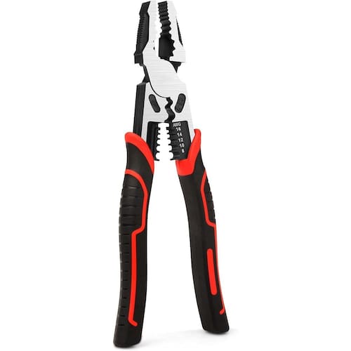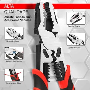 Alicate Universal 9 Pol. Multifuncional Corta Tudo Profissional Construído em Aço Cromo Vanádio, Alicatw Multifunção da Bravo Tools, atende com perfeição todas as suas necessidades: Corta, Decapa, Aperta, Prensa e muito mais. - Marca: Bravo Tools - Referência: AL09 - Tamanho: 9 polegadas 22,5cm - Fabricando em Aço Cromo Vanádio Forjado - 5 Funções: :: Lâmina de corte, corta tudo, para aço até 3mm e pregos até 8mm :: Chave inglesa :: Prensa terminais 2.5, 4, 6 e 8mm :: Desencapa fios de 1.5, 2.5, 4, 6 e 8mm :: Aperto firme multiuso - Com liga de alta resistência, é capaz de cortar até 10.000x sem perder o fio ou enfraquecer - Suas pinças foram projetadas para entregar o máximo de precisão e eficiência em seus trabalhos com alta aderência e fácil manuseio é até 10x mais poderoso que alicates comuns. - Com empunhadura ergonômica, fornece uma pegada firme e uma aderência incrível nas mãos, exigindo muito menos força para ser . - Peso: 400 gramas - : 90 dias Marca: Não Informado