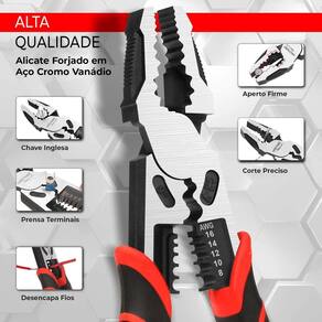 Alicate Universal 9 Pol. Multifuncional Corta Tudo Profissional Construído em Aço Cromo Vanádio, Alicatw Multifunção da Bravo Tools, atende com perfeição todas as suas necessidades: Corta, Decapa, Aperta, Prensa e muito mais. - Marca: Bravo Tools - Referência: AL09 - Tamanho: 9 polegadas 22,5cm - Fabricando em Aço Cromo Vanádio Forjado - 5 Funções: :: Lâmina de corte, corta tudo, para aço até 3mm e pregos até 8mm :: Chave inglesa :: Prensa terminais 2.5, 4, 6 e 8mm :: Desencapa fios de 1.5, 2.5, 4, 6 e 8mm :: Aperto firme multiuso - Com liga de alta resistência, é capaz de cortar até 10.000x sem perder o fio ou enfraquecer - Suas pinças foram projetadas para entregar o máximo de precisão e eficiência em seus trabalhos com alta aderência e fácil manuseio é até 10x mais poderoso que alicates comuns. - Com empunhadura ergonômica, fornece uma pegada firme e uma aderência incrível nas mãos, exigindo muito menos força para ser . - Peso: 400 gramas - : 90 dias Marca: Não Informado Ean: 7734625974912