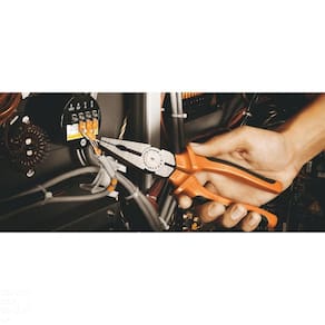 Versátil, o alicate universal da Tramontina PRO foi projetado para ser utilizado nas mais diversas operações, como puxar, prender, enrolar, deformar e cortar. A ferramenta certa para você que trabalha na indústria ou oficinas mecânicas. Orientações Forjado em aço cromo vanádio. Cabeça e articulação polidas. Têmpera total no corpo. Têmpera por indução no gume de corte.DIN ISO 5746.Isolação elétrica de 1.000 V CA.Produto em conformidade com a NBR9699 e NR10.Os alicates de corte são testados quanto à resistência ao desgaste do gume de corte em máquina de ensaio específica.Os alicates possuem dureza diferenciada no gume de corte e no corpo.Os alicates também são testados com relação à aderência das empunhaduras de PVC.Um ensaio de extrema importância analisa o grau de isolação do revestimento aplicado sobre os cabos dos alicates isolados, e que promove segurança na sua utilização em locais com tensões de até 1.000 V CA.Puxar, prender,enrolar, deformar e cortar arames e chapas finas.As ferramentas são produzidas e testadas conforme normas específicas. Características Gerais EAN13 7891114057911 DUN14 17891114057918 NCM 8203.20.10 Peso Líquido 0,3900 kg. Peso Bruto 0,3900 kg. Metragem 0,000660 m³. Dimensões Embalagem (Compr. X Larg. X Alt.) 275x 80x 30 mm. Dimensões Produto (Compr. X Larg. X Alt.) 215x 55x 20 mm. Cor 1 EF8134 Hexa Dimensão Extra A 29,0 mm. Dimensão Extra B 215,0 mm. Dimensão Extra C 20,0 mm. Dimensão Extra D 55,0 mm. Dimensão Extra E 14,0 mm. Observações Use óculos, luvas e outros equipamentos de proteção individual (EPIs) de acordo com a tarefa a ser executada. Observe as indicações de uso de cada tipo de alicate. Nunca utilize um alicate para cortar arames endurecidos, a não ser que tenha sido projetado para este fim. Nunca utilize o alicate como martelo. Ele pode trincar ou até mesmo quebrar. Nunca exponha os alicates ao calor excessivo. Isto pode alterar o tratamento térmico aplicado no corte e afetar o seu desempenho. Sempre posicione o corte do alicate perpendicularmente ao eixo do arame para uma operação mais rápida e segura. Utilize alicates isolados, identificados pela marcação 1.000 V no cabo, quando for necessário trabalhar em locais com corrente elétrica. Importante: nestes casos, inspecione a integridade da isolação elétrica, e, se aparecerem trincas na isolação, suspenda o uso imediatamente. Nunca aumente o comprimento dos cabos dos alicates. Isto amplifica a força exercida sobre a cabeça da ferramenta podendo quebrá-la. Nunca utilize o alicate em porcas e parafusos. Para estes trabalhos, indica-se o uso de chaves de aperto. Lubrifique periodicamente a articulação. Isto aumenta a vida útil do produto e melhora sua performance. Manter os alicates longe do alcance de crianças. Armazene em local limpo e seco.