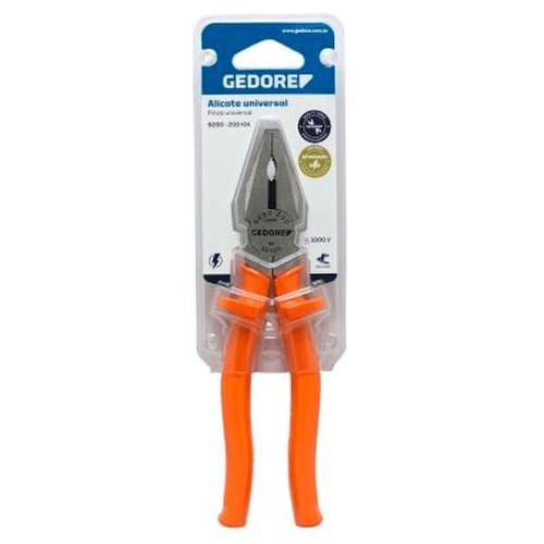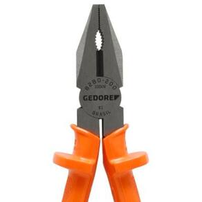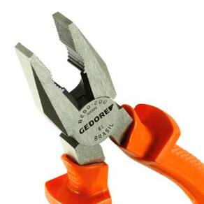 Alicate isolado com corpo em aço Gedore-Vanadium e empunhadura em polímero anti-chamas laranja. Ergonômico e antideslizante, atende normas de segurança NR 10 e NBR 9699 para isolação até 1000V. Faces lixadas, tratamento térmico total, corte temperado por indução (62 - 65 HRC). Inclui embalagem autoserviço. Permite cortar, puxar, segurar e dobrar fios. Indicado para cortar todos os tipos de arame, inclusive arame com dureza média, diâmetro máximo de Ø 1,6 mm e resistência à tração de 1600 N/mm².