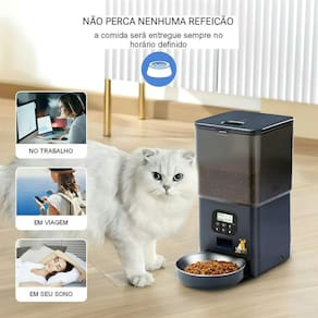Características: - qualidade, bem estar, durabilidade e confiança; - seu pet mais saudável com porções bem distribuídas ; - tranquilidade em saber que o seu animal está recebendo seu alimento, na hora certa; - botão com proteção se o seu animal tocar o botão não mudará a programação ; - gravação: a função permite que você grave sua voz ou algum som para que seja emitido antes da refeição do seu animal. Você pode gravar 10 segundos; - cada porção tem cerca de 5 gramas. Você pode definir o tamanho da refeição para 1-40 porções ou seja, entre 5 gramas e 200 gramas , conforme as necessidades do porte do seu animal de estimação; - a bandeja de aço inoxidável higiênica e fácil de limpar ; - tanque de alimentos removível e fácil de limpar; - base é estável e antiderrapante.