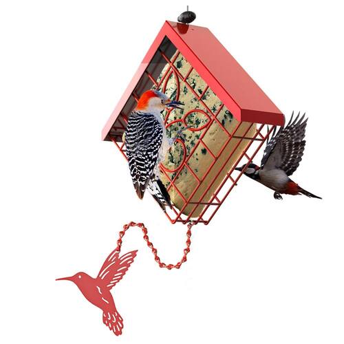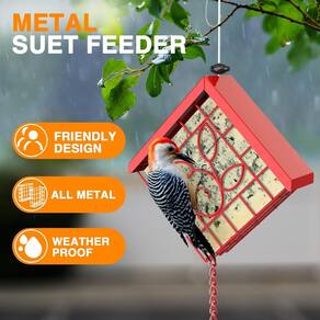 - Materiais de alta qualidade: Feito de metal revestido a pó resistente às intempéries, projetado com teto para manter a chuva fora, este alimentador de gaiola de sebo é feito para durar. O gancho de bloqueio de teto resistente ajuda a deter esquilos, garantindo que os bolos de sebo permaneçam acessíveis apenas aos pássaros.