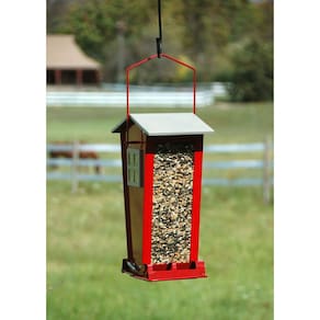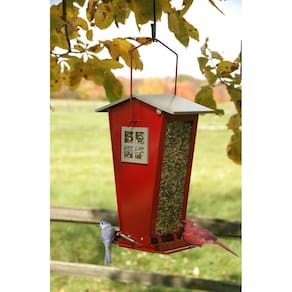 Alimentador com poleiros com mola que se fecham para impedir a entrada de visitantes indesejados, garantindo que apenas esquilos possam acessar a semente na caçamba.