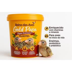 Alimento Para Filhotes Reino das Aves Gold Papa 400g Descrição do produto - Reino das Aves Gold Papa Filhotes 400 g Gold Papa Super Premium é a papinha para alimentação manual de filhotes de aves ornamentais. Desenvolvida para a fase inicial da vida, ajuda no crescimento equilibrado e na transição segura até a alimentação sólida. A formulação é enriquecida com vitaminas e minerais e contém enzimas, probiótico e prebiótico, auxiliando a digestão e o equilíbrio da flora intestinal.