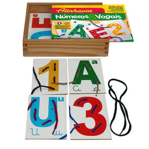 Alinhavos números e vogais 15 placas e 15 cadarços Conjunto de placas para alinhavo fabricadas em mdf, medindo 10x15x0,4cm, contendo 15 placas ilustradas e 15 cadarços coloridos. Produto de qualidade comprovada. - acondicionado em caixa de madeira. - embalagem: 26x21x6 cm Certificado INMETRO CE-BRI/003-14N3107-07 NM 300/2002