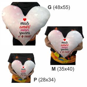 DESCRIÇÃO DO PRODUTO1. Almofadas no formato de coração em 3 tamanhos: Tamanho P 28x34cm, tamanho M 35x40cm e tamanho G 48x55cm;2. Impressão / estamparia de alta qualidade, em tecido pelúcia, super macio, antialérgico e muito sedoso. Estampa frente e verso. As almofadas vão bem cheias! Proporcionando mais conforto para quem usa. Um excelente presente!3. Enchimento em fibra sintética siliconada, antialérgica, macia, não solta pelos, não tem cheiro, pode ser lavada.