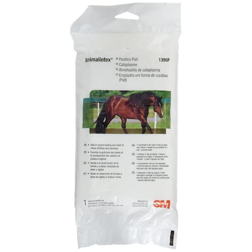 A trusted remedy in equine care, the 3M Animalintex Poultice Pad helps treat a wide range of hoof and leg ailments in horses. This ready-to-use pad is a multi-layered dressing that can be used as a hot poultice (warm and wet) to draw out infections and abscesses, as a cold poultice to reduce swelling and soothe strains or bruises, or even as a dry dressing on open wounds to absorb fluids. Its versatility makes it a staple in any horse owner’s first aid kit.