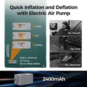 Almofada de dormir de acampamento autoinflável OGERY — O máximo conforto para aventuras ao ar livre One-Touch Inflation Magic Diga adeus às bombas manuais! Nosso colchão de acampamento possui uma bomba inteligente embutida que infla totalmente em apenas 40 segundos com um único toque de botão. A função de deflação rápida torna a embalagem igualmente fácil, pronta em 90 segundos. Luxuoso Memory Foam Comfort de 3,15" Experimente um sono com qualidade de hotel ao ar livre com nossa almofada de dormir ultra-grossa para acampar. A espuma viscoelástica premium se adapta ao seu corpo, enquanto o tecido de malha elástica 50D para uso externo oferece suporte durável durante toda a noite. Bomba removível e recarregável A poderosa bomba operada por bateria de 7,4 V 1200 mAh é removível e recarregável. Chega de procurar tomadas elétricas ou carregar equipamentos extras, basta a conveniência de acampar. Perfeita para campistas medindo 76,77" x 26,38" quando inflada (dobra para 27,56" x 10,63"), esta almofada de dormir de acampamento oferece conforto espaçoso enquanto permanece portátil. Com 5,95 libras, é ideal para acampar de carro, viagens de trailer ou roupa de cama para hóspedes. Desempenho em todas as estações Com um excepcional valor R de 9,5, nossa almofada de dormir isolada oferece uma regulação superior da temperatura, mantendo você aquecido no inverno e confortável no verão. Atualize sua experiência de sono ao ar livre hoje mesmo! A almofada de acampamento autoinflável OGERY oferece conforto incomparável onde quer que suas aventuras o levem.