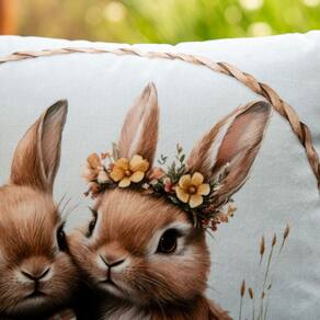 Contém: 1 Almofada com enchimento em fibra siliconada. Tamanho: 43 x 43 cm Material: Veludo Detalhes: Sem aplicações Fechamento: Zíper Invisível Forma: Quadrada Cor: Azul, bege e marrom Estampa frente: Casal de Coelhos Estampa verso: Casal de Coelhos Produto: Nacional
