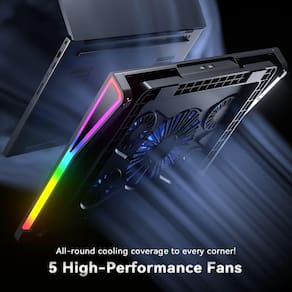 ?5 ventiladores eficientes e silenciosos?O ventilador de resfriamento do laptop para jogos atinge o equilíbrio perfeito entre resfriamento e silêncio. 5 ventiladores de alto desempenho são distribuídos uniformemente e o vento forte cobre uma área ampla, garantindo a dissipação total do calor na parte inferior do dispositivo. No modo U3 padrão, quando o refrigerador do laptop está ligado, quando todos os ventiladores estão funcionando e fornecendo ar frio, o ruído é de apenas 25dB, que é sussurro e silencioso, não afeta o descanso de outras pessoas e retira o calor.