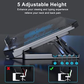-?Design ergonômico?Almofada de resfriamento com ventilador de laptop como suporte ergonômico, com 4 reguláveis em altura. Altura: 2,3"-5,1" (6-12cm). Ângulo (9-28 graus), também equo com um defletor antiderrapante removível, evita efetivamente que o laptop escorregue.