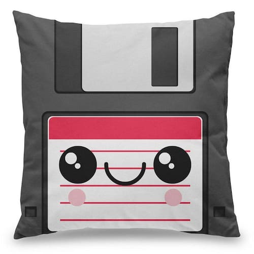 A almofada é estampada na frente com o desenho do disquete e possui verso na cor preta. Além disso, ela conta com zíper, facilitando a lavagem quando necessário. Seu material é feito de poliéster e possui fibra de poliéster siliconizada, garantindo um toque macio e confortável.