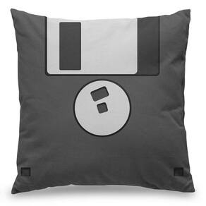 A almofada é estampada na frente com o desenho do disquete e possui verso na cor preta. Além disso, ela conta com zíper, facilitando a lavagem quando necessário. Seu material é feito de poliéster e possui fibra de poliéster siliconizada, garantindo um toque macio e confortável.