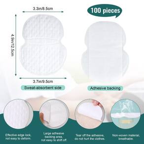 da embalagem?O conjunto inclui 100 almofadas de suor nas axilas no total, quantidade suficiente para atender às suas necessidades diárias de uso e substituição. O tamanho de cada almofada é de 5,5 x 6,1 polegadas (14 x 15,5 cm).