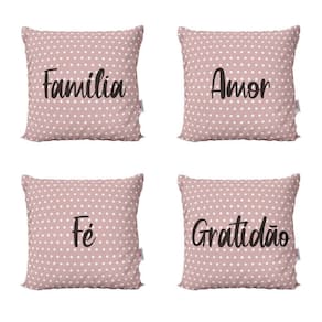Almofadas Decorativas Rosa Decorativas Família, Amor, Fé e Gratidão Para Sofá 40x40 - Novadecora Decorar sua casa com lindas Almofadas é aliar conforto e personalidade. E não existe sensação melhor do que poder chegar em casa depois de um dia cansativo de trabalho e curtir o aconchego do nosso lar. E por falar em aconchego, um item que transmite muito bem isso são as Almofadas Decorativas que você encontra na Novadecora. Se você é daqueles que adora decoração e gosta de deixar a sua casa com a sua personalidade, aqui na Novadecora é o lugar ideal para encontrar as almofadas mais lindas, dos mais variados estilos. Kit Com 4 Almofadas Decorativas em impressão digital com estampa exclusiva frente e verso TECIDO Capa confeccionada em tecido Oxford 100% poliéster, um tecido de ótima qualidade e durabilidade. O Oxford proporciona mais conforto e um toque agradável, além das cores ficarem mais vivas deixando seu ambiente mais decorado. Características e especificações: Marca: Novadecora Almofada já cheia Pronta para uso Almofada lavável - sem perder a qualidade e impressão Zíper invisível Dimensões lxa 40x40 cm É produto personalizado: Sim Conteúdo da embalagem 4 almofadas com enchimentos Importante sobre lavagem: - Lavar manualmente com sabão neutro - Temperatura máxima de lavagem 40°C. - Não usar alvejante. - Secar a sombra. - Temperatura máxima de base do ferro 110°C. - Não limpar a seco. : Três meses contra defeitos de fabricação. As cores das estampas podem variar de acordo com a calibração do seu monitor. AVISO: Não nos responsabilizaremos pela diferença de cores em caso de pedidos feitos separadamente, no caso produzidos em lotes diferentes. Marca: Novadecora Ean: 6015246341347