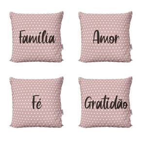 Almofadas Decorativas Rosa Decorativas Família, Amor, Fé e Gratidão Para Sofá 40x40 - Novadecora Decorar sua casa com lindas Almofadas é aliar conforto e personalidade. E não existe sensação melhor do que poder chegar em casa depois de um dia cansativo de trabalho e curtir o aconchego do nosso lar. E por falar em aconchego, um item que transmite muito bem isso são as Almofadas Decorativas que você encontra na Novadecora. Se você é daqueles que adora decoração e gosta de deixar a sua casa com a sua personalidade, aqui na Novadecora é o lugar ideal para encontrar as almofadas mais lindas, dos mais variados estilos. Kit Com 4 Almofadas Decorativas em impressão digital com estampa exclusiva frente e verso TECIDO Capa confeccionada em tecido Oxford 100% poliéster, um tecido de ótima qualidade e durabilidade. O Oxford proporciona mais conforto e um toque agradável, além das cores ficarem mais vivas deixando seu ambiente mais decorado. Características e especificações: Marca: Novadecora Almofada já cheia Pronta para uso Almofada lavável - sem perder a qualidade e impressão Zíper invisível Dimensões lxa 40x40 cm É produto personalizado: Sim Conteúdo da embalagem 4 almofadas com enchimentos Importante sobre lavagem: - Lavar manualmente com sabão neutro - Temperatura máxima de lavagem 40°C. - Não usar alvejante. - Secar a sombra. - Temperatura máxima de base do ferro 110°C. - Não limpar a seco. : Três meses contra defeitos de fabricação. As cores das estampas podem variar de acordo com a calibração do seu monitor. AVISO: Não nos responsabilizaremos pela diferença de cores em caso de pedidos feitos separadamente, no caso produzidos em lotes diferentes.