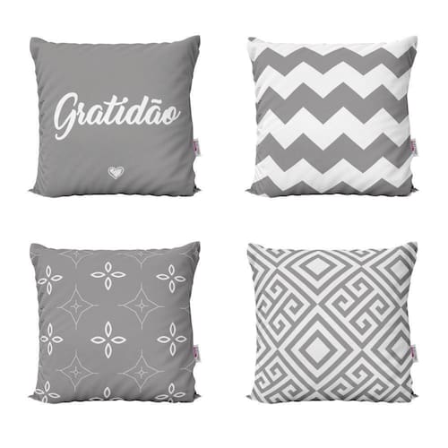 Almofadas Geometricas Cinza Gratidão Para Quarto 40X40Decorar sua casa com lindas Almofadas é aliar conforto e personalidade.E não existe sensação melhor do que poder chegar em casa depois de um dia cansativo de trabalho e curtir o aconchego do nosso lar.E por falar em aconchego, um item que transmite muito bem isso são as Almofadas Decorativas que você encontra na Novadecora.Se você é daqueles que adora decoração e gosta de deixar a sua casa com a sua personalidade, aqui na Novadecora é o lugar ideal para encontrar as almofadas mais lindas, dos mais variados estilos.Kit Com 4 Almofadas Decorativas em impressão digital com estampa exclusiva frente e versoTecidoCapa confeccionada em tecido oxford 100% poliéster, um tecido de ótima qualidade e durabilidade. O oxford proporciona mais conforto e um toque agradável, além das cores ficarem mais vivas deixando seu ambiente mais decorado.Características e especificações:Marca: novadecoraTecido: oxfordAlmofada já cheia pronta para usoFibra siliconizada anti-alérgica e anti-ácaro com forro em tntAlmofada lavável - sem perder a qualidade e impressãoZíper invisívelDimensões lxa 40x40 cmConteúdo da embalagem 4 almofadas com enchimentos - AmareloImportante sobre lavagem:- Lavar manualmente com sabão neutro- Temperatura máxima de lavagem 40°C. - Não usar alvejante. - Secar a sombra.- Temperatura máxima de base do ferro 110°C. - Não limpar a seco.Garantia:Três meses contra defeitos de fabricação.As cores das estampas podem variar de acordo com a calibração do seu monitor.AVISO: Não nos responsabilizaremos pela diferença de cores em caso de pedidos feitos separadamente, no caso produzidos em lotes diferentes.Agradecemos a visita e boas compras Marca: Novadecora