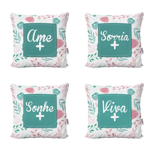 Almofadas Personalizadas Ame, Sorria, Sonhe, Viva Para Sofá 40x40 - Novadecora Decorar sua casa com lindas Almofadas é aliar conforto e personalidade. E não existe sensação melhor do que poder chegar em casa depois de um dia cansativo de trabalho e curtir o aconchego do nosso lar. E por falar em aconchego, um item que transmite muito bem isso são as Almofadas Decorativas que você encontra na Novadecora. Se você é daqueles que adora decoração e gosta de deixar a sua casa com a sua personalidade, aqui na Novadecora é o lugar ideal para encontrar as almofadas mais lindas, dos mais variados estilos. Kit Com 4 Almofadas Decorativas em impressão digital com estampa exclusiva frente e verso TECIDO Capa confeccionada em tecido Oxford 100% poliéster, um tecido de ótima qualidade e durabilidade. O Oxford proporciona mais conforto e um toque agradável, além das cores ficarem mais vivas deixando seu ambiente mais decorado. Características e especificações: Marca: Novadecora Almofada já cheia Pronta para uso Almofada lavável - sem perder a qualidade e impressão Zíper invisível Dimensões lxa 40x40 cm É produto personalizado: Sim Conteúdo da embalagem 4 almofadas com enchimentos Importante sobre lavagem: - Lavar manualmente com sabão neutro - Temperatura máxima de lavagem 40°C. - Não usar alvejante. - Secar a sombra. - Temperatura máxima de base do ferro 110°C. - Não limpar a seco. : Três meses contra defeitos de fabricação. As cores das estampas podem variar de acordo com a calibração do seu monitor. AVISO: Não nos responsabilizaremos pela diferença de cores em caso de pedidos feitos separadamente, no caso produzidos em lotes diferentes.