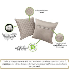 Características do Produto: Enchimento: Fibra de Poliéster 100% siliconada ensacada em capa de TNT; Zíper: Invisível, permitindo a retirada da capa para limpeza ou substituição; Revestimento: Veludo; Diferenciais: _Anti-alérgico; _Anti-mofo;
