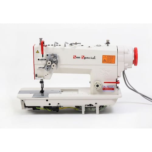 Descrição Resumida:Máquina pesponto barra alternada;2 agulhas e 4 linhas;Transporte duplo (agulha + dente);Aplicação: Materiais leves;Bitola: 6,4 mm;Comprimento do ponto: 4 mm;Altura da agulha: 35 mm;Altura do calcador: 10 mm;Velocidade: 4.000 RPM;Lançadeira pequena;lubrificação por pavio;Motor convencional;Agulha: DPX5 #14.Acompanha mesa e motor.Informações sobre a garantia:A MONTAGEM É FEITA POR CONTA DO COMPRADOR !