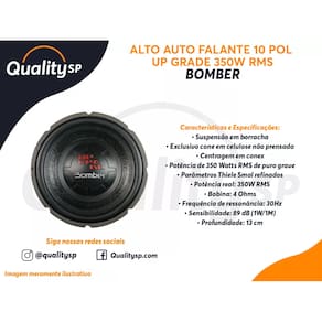 Fabricado desde 1996, os alto-falantes da Bomber surgiram, na verdade, com o nome de UpGrade. Agora a empresa homenageia o seu primeiro nome e disponibiliza no mercado o Subwoofer 10" Bomber Upgrade - 350 Watts RMS. Com constante aperfeiçoamento e equilíbrio total, seus graves macios e profundos são as principais características deste equipamento. Sua impedância é de 4 Ohms em bobina Simples, a capacidade musical atinge 700 watts de potência e a sensibilidade é de 89Db. Mais uma vez a Bomber mostra a sua cara e disponibiliza um excelente produto para os exigentes fanáticos por sonorização automotiva.