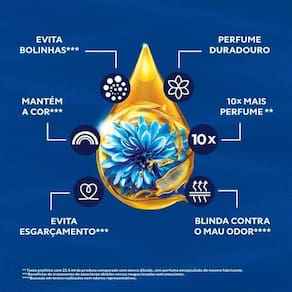 Quando você se movimenta, essas cápsulas de perfume para roupas se rompem e liberam essa fragrância incrível, fazendo com que aquele cheirinho de roupa lavada dure muito mais! Além disso, sua fórmula contém óleo de argan*****, um óleo natural com alto potencial nutritivo, que perfuma e trata suas roupas, prevenindo os danos da lavagem, mantendo as cores*** do tecido vibrantes por mais tempo, evitando a formação de bolinhas*** e esgarçamento***.