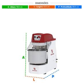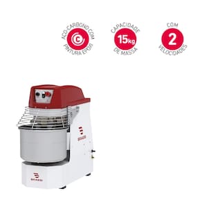 Especificações: - Estrutura em aço com acabamento em pintura epóxi; - Carenagem em polímero termoformado de alta resistência; - Tacho em aço inox; - Grade cromada; - Batedor espiral em ferro com acabamento estanhado; - Possui grade de segurança que desliga o equipamento ao ser levantada - Capacidade 15Kg de massa; - Dimensões (AxLxP) 78x43x88 cm; - Capacidade de farinha: 9 Kg;