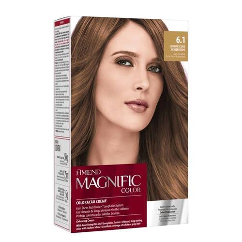 Amend Magnific Tinta 6.1 Louro Escuro Acinzentado DESCRIÇÃO:Tintura Magnific Color Loiro Escuro Acinzentado 6.1 Amend traz tons vibrantes que promovem cobertura perfeita dos fios brancos. Coloração permanente em creme.AÇÃO/ATIVOS:Sua fórmula é enriquecida com proteína do Arroz que possui efeito restaurador e protetor, ou seja, a cor do seu cabelo é renovada e a estrutura capilar preservada. Garante longa duração, além de proporcionar brilho radiante e maciez enquanto colore os fios. Imagem meramente ilustrativa. O produto pode ter variação de cor ou desenho, porém as características gerais são as mesmas especificadas na descrição do produto.MODO DE USAR:Coloque as luvas. Despeje todo o conteúdo da bisnaga de Coloração Creme dentro do frasco aplicador de Emulsão Reveladora. Feche a tampa do frasco aplicador e agite bem até obter uma emulsão homogênea. Quebre imperativamente a ponta do frasco aplicador imediatamente após ter agitado a mistura, a fim de evitar projeções indesejadas do produto ou estourar o frasco. Aplique a emulsão homogênea nos cabelos, começando pela raiz nos cabelos secos até as pontas. Massageie o cabelo até que a coloração esteja bem distribuída. Deixe agir por cerca de 35 minutos, em seguida enxágue com água em abundância até remover todos os resíduos. Finalize como desejar.ESTE ANÚNCIO CONTÉM: 01 UNIDADE DE AMEND MAGNIFIC 6.1 LOURO ESCURO ACIZENTADOAmend Magnific Tinta 6.1 Louro Escuro Acinzentado