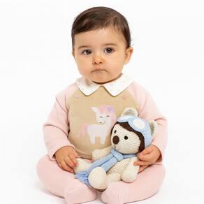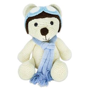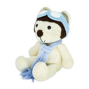 Urso aviador amigurumi confeccionado em crochê artesanal, com trabalho totalmente manual. Possui enchimento com manta própria para lavagem, garantindo maciez e segurança.