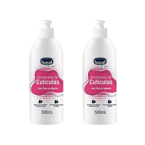 Amolecedor de cutículas ideal 500ml com óleo de algodão - kit com 2 unidades Descrição O amolecedor de cutículas ideal 500ml com óleo de algodão foi desenvolvido para facilitar a remoção de cutículas de forma suave e eficaz. Enriquecido com óleo de algodão, conhecido por suas propriedades emolientes e hidratantes, este produto ajuda a amolecer as cutículas rapidamente, tornando o processo de manicure mais fácil e confortável. Além disso, seu uso regular contribui para a hidratação e nutrição da pele ao redor das unhas, mantendo-as com aparência saudável e bem cuidada. Modo de uso Aplique uma pequena quantidade do amolecedor de cutículas ideal diretamente sobre as cutículas. Deixe agir por alguns minutos para que o produto possa amolecer as cutículas, facilitando a sua remoção. Empurre e remova as cutículas com o auxílio de um palito ou espátula, conforme preferir. Lave bem as mãos após o uso para retirar qualquer resíduo. Utilize sempre que for fazer a manicure para manter as cutículas macias e bem tratadas. Marca: Não Informado