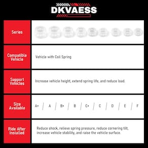 Características: 1. Resolve efetivamente o problema de fraqueza das molas quando carga pesada e melhora o desempenho do amortecedor. 2. Melhora o conforto de condução e mais estável durante as curvas. 3. Reduza o bombeamento do absorvente ao passar pela corcunda da estrada ou linha amarela. 4. Reduz o ruído e a vibração durante a viagem. 5. Protege o amortecedor e o sistema de suspensão para evitar vazamento de óleo. 6. Prolonga a vida útil do absorvente mais de 2 vezes. 7. Melhora a eficiência de frenagem. 8. Tamanho para todos os tipos de carro, incluindo mola abaixada e ajustável. A/B/C/D/E/F. Tipo: Tipo A -- Abertura: 47 mm Espessura: 13 mm Altura: 75 mm Diâmetro: 173 mm Tipo B -- Abertura: 37 mm Espessura: 13 mm Altura: 65 mm Diâmetro: 160 mm Tipo C -- Abertura: 27 mm Espessura: 10 mm Altura: 55 mm Diâmetro: 131 mm Tipo D -- Abertura: 23 mm Espessura: 10 mm Altura: 48 mm Diâmetro: 113 mm Tipo E -- Abertura: 15 mm Espessura: 9 mm Altura: 39 mm Diâmetro: 112 mm Tipo F -- Abertura: 12 mm Espessura: 15 mm Altura: 38 mm Diâmetro: 120 mm Dicas de instalação: 1. Levante o carro até que a mola seja totalmente estendida. 2. Limpe a mola e, em seguida, borrife um pouco de água ou óleo nela (para facilitar a instalação dos amortecedores) 3. Instale os amortecedores. Normalmente, o amortecedor é instalado na altura média da mola Incluído na embalagem: 1 conjunto (2 peças) x almofada de mola para amortecedor - Antes da instalação: meça a distância da mola (H2) quando o carro estiver parado (não é necessário usar um macaco ou outras ferramentas para levantá-lo). Depois de medir os dados, use um macaco para levantar o veículo e relaxar completamente a mola. Meça o espaço entre as molas (H2) e selecione o tamanho apropriado para suporte extra. Escolha o tamanho (B+) do amortecedor de borracha, se a folga da mola da bobina do carro (quando levantada e descarregada) estiver entre 4 cm e 4 cm - Resolve efetivamente o problema de fraqueza das molas quando carga pesada e melhora o desempenho do amortecedor. - Melhora o conforto de condução e mais estável durante as curvas. - Reduza o bombeamento do absorvente ao passar pela corcunda da estrada ou linha amarela. - Reduz o ruído e a vibração durante a viagem.
