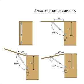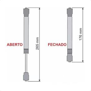 Especificações: - Acabamento: Haste cromada e corpo pintado; - Cor: cinza e prata; - Material: Ao e plástico; - Capacidade: 12 Kg; - Dimensão entre eixos: 265 mm; - Curso til: 91 mm; - Espessura de 15 mm; - Ângulo de Abertura: 75 / 90 / 110; - Não é necessário lubrificar o produto, óleos ou similares podem danificar o pistão. O alinhamento na instalação é importante para o funcionamento adequado; - Garantia e qualidade Cermag; - Fórmula para calcular a força ideal que irá precisar para seu pistão: 6 x Peso x Altura / 1000; - *Exemplo uma porta de MDF 15mm, com altura de 600mm e peso de 2,6kg: - **6 x 2,6 x 600/1000 = 9,36kg. - ***Ou seja, neste caso o pistão ideal é o de 10kg ou (100N). - Utilize 2 pistões em caso de portas com peso superior até o dobro dos valores indicados na tabela: - Para portas de 12 kg - Utiliza-se um Pistão a Gás de 120 N;