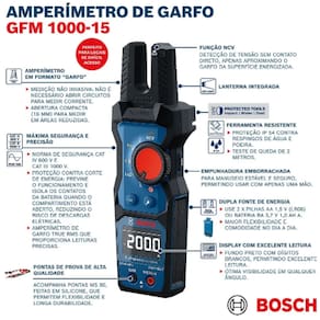 O amperímetro de garfo GFM 1000-15 Professional foi projetado para profissionais que precisam de verificações rápidas e eficientes de corrente CA e tensão CA/CC. Com seu design de grampo aberto, você pode medir corrente de até 200 A CA sem cabos de teste para economizar tempo e esforço. Esta ferramenta multifuncional mede corrente CA, tensão CA/CC de até 1.000 V, continuidade, resistência e possui LoZ V CA/CC integrado. Com proteção IP54, sua construção robusta garante resistência a quedas acidentais de até 2 m e condições adversas. Além disso, a empunhadura confortável reduz a fadiga durante o uso prolongado, o que o torna indispensável para eletricistas e técnicos de HVAC.