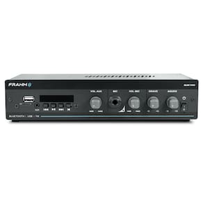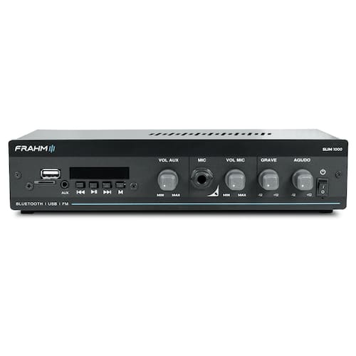 O amplificador Slim 1000 App G5 da Frahm possui 40 Watts RMS de potência e é ideal para pequenos ambientes. Possui entradas USB, SD Card, auxiliar (RCA), Microfone, Rádio FM e Bluetooth.