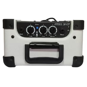 O amplificador Steel 20GT possui 15W RMS, alto-falante de 6 polegadas, canal limpo e canal distorção e saída para fone de ouvido.