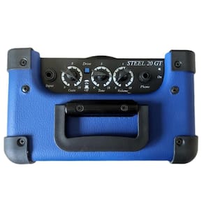 O amplificador Steel 20GT possui 15W RMS, alto-falante de 6 polegadas, canal limpo e canal distorção e saída para fone de ouvido.
