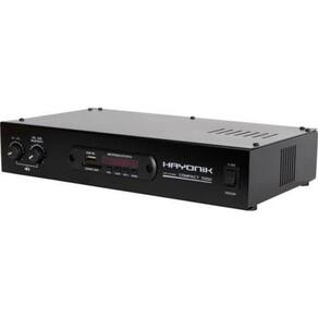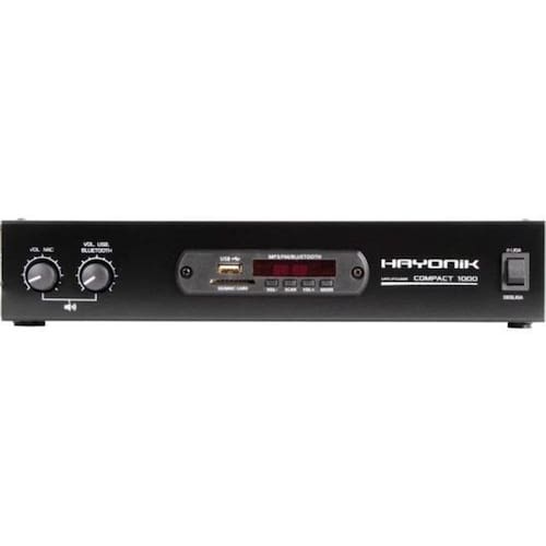 Amplificador hayonik compact 1000 80w rms com bluetooth O amplificador hayonik compact 1000 é um modelo versátil, prático e de fácil manuseio. Possui entrada usb, sd, aux rca, microfone, rádio fm e bluetooth. É leve, compacto e de fácil instalação. Além disso, ele é o modelo ideal para quem busca praticidade e qualidade por um baixo custo. Equalização:volume mic, volume aux Alimentação:bivolt Peso:1,76kg Consumo de energia:160va Classe:ab Canais:4 Potência:80w rms Impedância:4 ohms Entradas:p10 mono/rca Saídas:até 8 caixas de 8 ohms 2 por canal Dimensões:78 x 310 x 210mm Thd:0,05% Pesquisa:amplificadorhayonikamplificador compactpotencia Modos: usb, sd, bluetooth, fm Tensão de rede: 100 a 240vac 60hz Controle remoto: sim Sensibilidade: microfone/guitarra 15mv Auxiliar 250mv Conteúdo da embalagem: 01 amplificador compact 1000 01 manual do proprietário e o certificado de 01 controle remoto 01 bateria para controle remoto Homologação da anatel: 05 150 -18 - 11597 Homologação Anatel: 112572013224 Marca: Não Informado