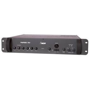 Amplificador para sonorização ambiente, podendo trabalhar em 4 ohms 300 + 300w rms ou 70 volts 300w rms . Gongo ding-dong c.V.I. Especificações técnicasEntradas: 2 microfones mic1 e mic2 com a função mic priority m.P. E c.V.I. 1 microfones mic3 p10 c.V.I. 2 entradas auxiliares in com conectores p10 canais l/r 2 entradas auxiliares a1 e a2 com conectores rca estéreo s.A E c.V.I. Saídas: 2 send com conector p10 1 remote aciona o gongo a distancia 1 auxiliar line out com 2 conectores rca mono 2 output a e output b com borne positivo e negativo e c.V.I. 1 saída 70v quando output a e output b são ligadas em bridge caixas com trafo de linha 70v respeitando potência máxima e perdas com cabos. Equalizador: 3 bandas - low, mid, high Consumo total à potência máxima: 840 w rms Proteção: alto-falantes / fusível / overload - sobrecarga e curto Alimentação:127/220v Dimensões mm : l 485 x h 90 x p 425 Peso kg : 7,8